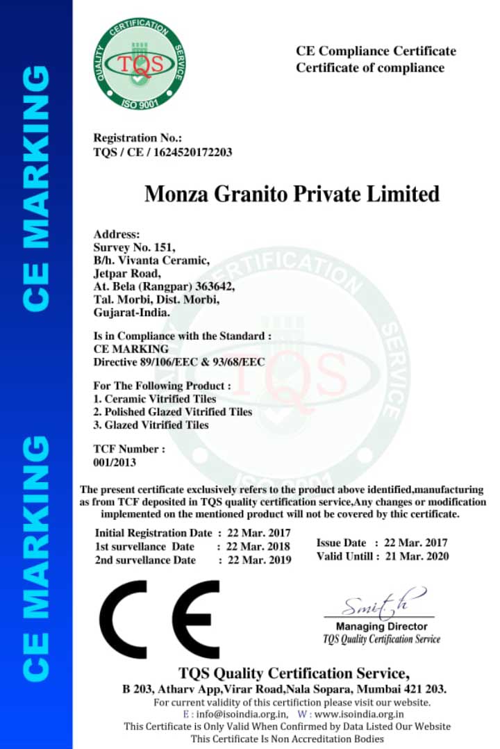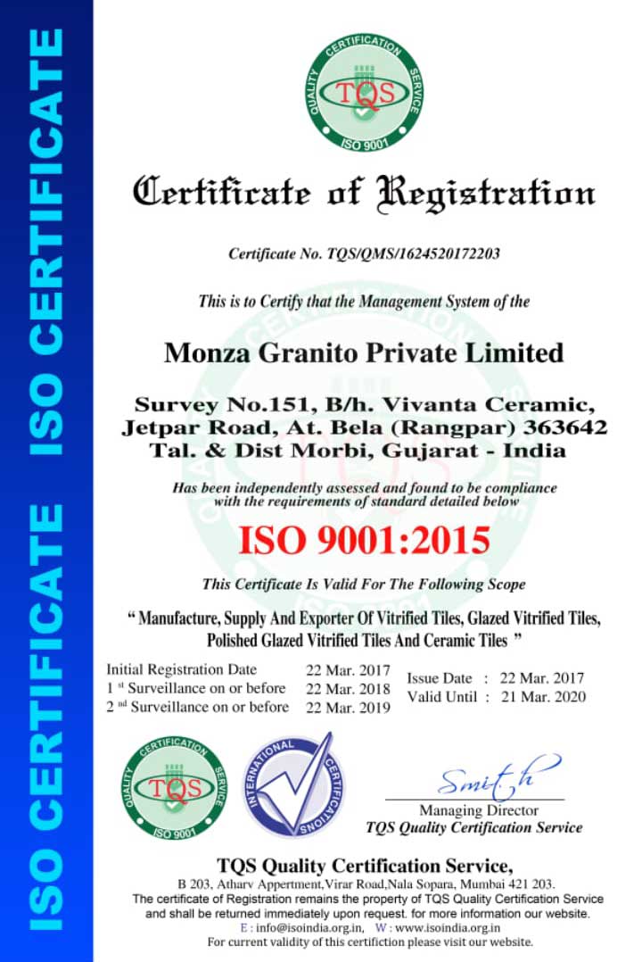 Morbi is the largest ceramic hub in India by being home to many ceramic companies and it has been our pleasure to serve as one of Morbi's renowned tile companies. We are one of the leading tiles manufacturing company not only in Morbi but in India and we are really proud of this achievement. Monza has been credited with many international and national standard certifications like ISO 9001:2008 & CE. For a decade we have been procuring raw materials at Gujarat's Morbi region and creating unique and high-quality products.
